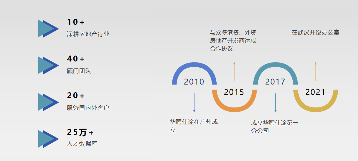 成立于2010年,总部位于广州,专注于地产行业人才寻访,一直致力于为企业输送合适的专业人才,已与数十家外资及国内地产公司达成合作协议,成为企业发展的人力资源战略合作伙伴。我司只专注于房地产行业,具有10多年房地产开发,商业运营,物业人才寻访经验; 具有超20万的人才储备资源库。